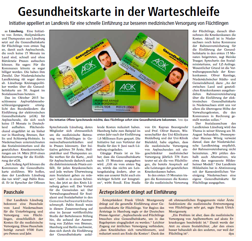 as Lüneburg. Im vergangenen Herbst haben sich Ärzte, Heilpraktiker und Therapeuten zu einer Initiative zusammengeschlossen. Sie bieten eine „Offene Sprechstunde“ für Flüchtlinge mittlerweile in sechs der zwölf städtischen Unterkünfte an. Um mobiler zu sein und das Angebot auszudehnen auch auf Unterkünfte, die wie Böhmsholz an der Peripherie der Stadt liegen, wünscht sich die Initiative einen Bus. Das kostet Geld. „Wir suchen deshalb Sponsoren“, sagt Elisabeth Winger, Sprecherin der Initiative.